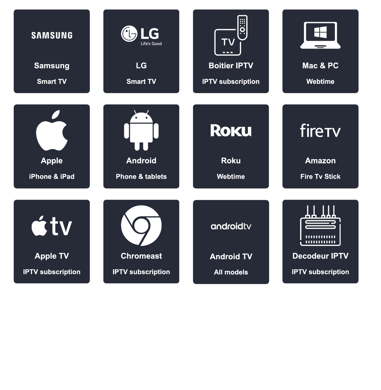 Various devices are supported by us, including Smart TV, Kodi, VLC, PC, Vu+, DreamBox, Enigma, Android Boxes, Android Smart Phones, and Max.